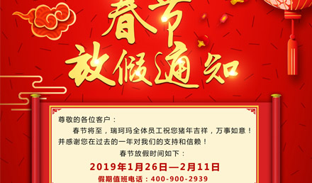 尊敬的新老客戶: 又是一年新來到!惜別2018,我們迎來了充滿希望、機遇和挑戰的2019年! 在此,感謝大家在過去一年里對瑞珂瑪的支持與信任。