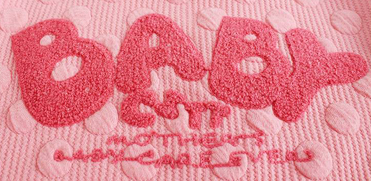 ? ? ? 屬于立體繡花,繡好效果很像毛巾布料,故名毛巾繡。主要運用于外套、T恤、毛衣、褲裝等。