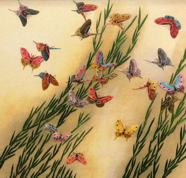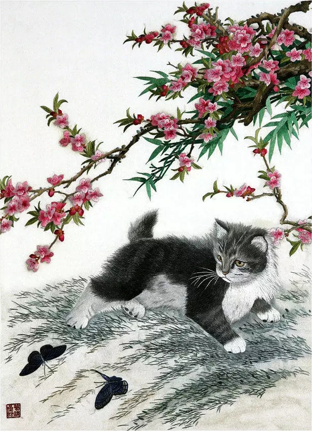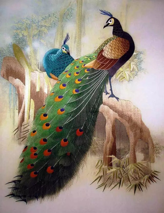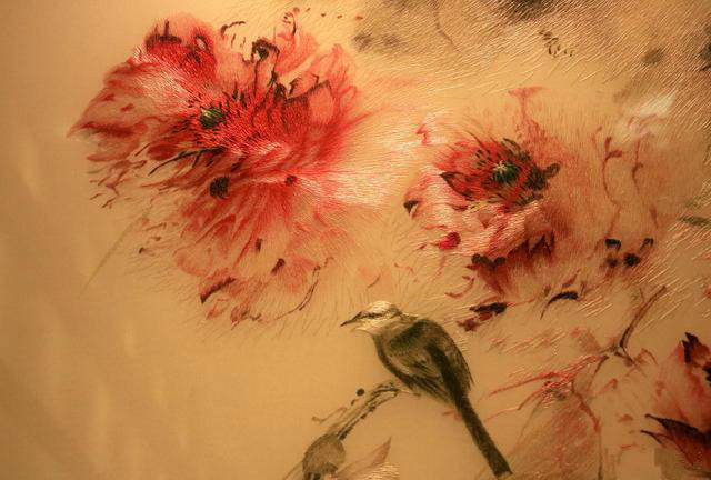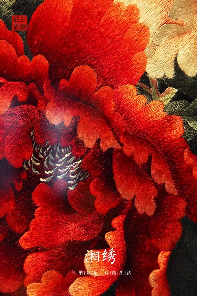 以湖南長沙為中心的刺繡品的總稱。是在湖南民間刺繡的基礎上,吸取了蘇繡和粵繡的優點而發展起來的。湘繡的特點是用絲絨線(無拈絨線)繡花,劈絲細致,繡件絨面花型具有真實感。常以中國畫為藍本,色彩豐富鮮艷,十分強調顏色的陰陽濃淡,形態生動逼真,風格豪放,曾有"繡花能生香,繡鳥能聽聲,繡虎能奔跑,繡人能傳神"的美譽。湘繡以特殊的鬅毛針繡出的獅、虎等動物,毛絲有力、威武雄健。