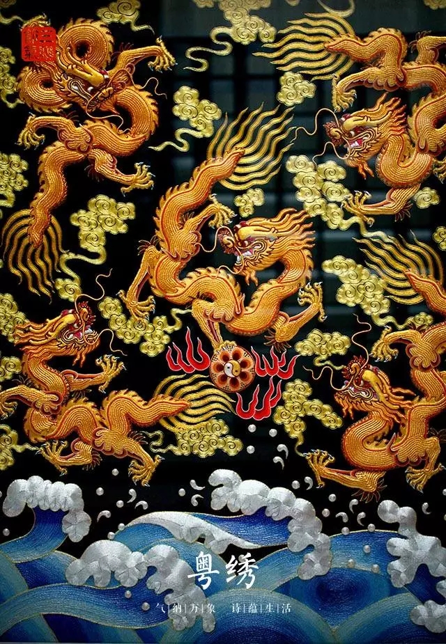 粵繡是廣東刺繡藝術的總稱,中國四大名繡之一。包括以廣州為中心的“廣繡”和以湖州為代表的“湖繡”兩大流派。具有構圖工整、豐富,色彩鮮艷明快的地方風格,尤以留水路(紋樣交接與重疊處空一線繡地)的技法更見特色。廣繡以雅致取勝,以平金繡法,適當墊錦,色彩稍為淡雅。
