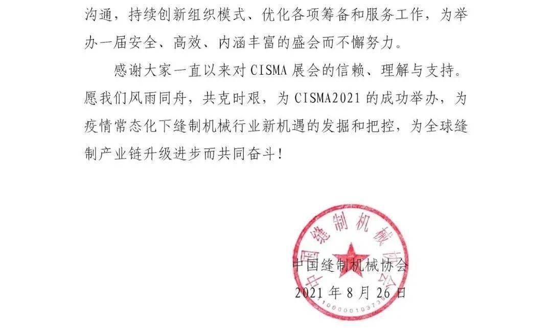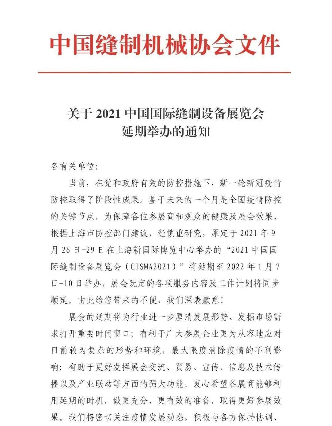 8月26日,中國縫制機械協會發布了《關于2021中國國際縫制設備展覽會延期舉辦的通知》,通知指出為保障參展商和觀眾的健康及展會效果,根據上海市防控部門的建議,經慎重研究,原定于2021年9月26日-29日在上海新國際博覽中心舉辦的“2021中國國際縫制設備展覽會(CISMA2021)”將延期至2022年1月7日-10日舉辦。