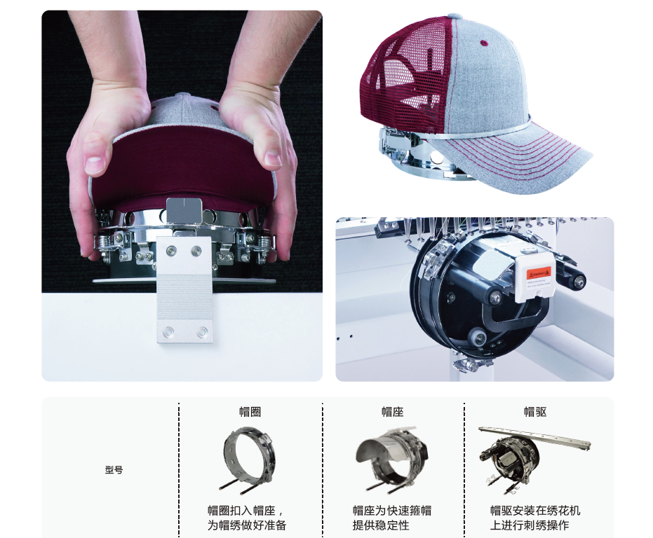 帽繡裝置由帽圈、帽座和帽驅組成。