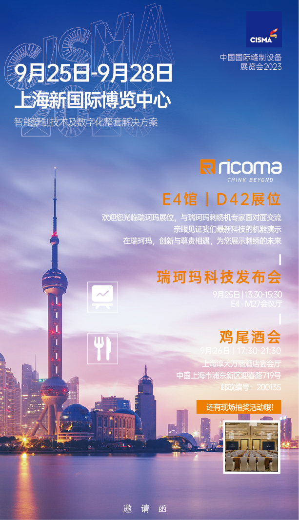 CISMA2023是世界縫制機械產業的晴雨表和風向標,將集結全球縫制領域頂尖科技,匯聚全球縫制機械全產業鏈,為下游行業數字化轉型提供強大助力。作為后疫情時代的首屆展會,時隔四年,9月25日-28日,瑞珂瑪攜”縫紉黑科技”,亮相CISMA2023展會。